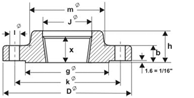 | Nominal Pipe size | Flange | Hub m mm. Inches | Raised Face g mm. Inches | Drilling Template | Approx. weight Kg. Pounds | |||||